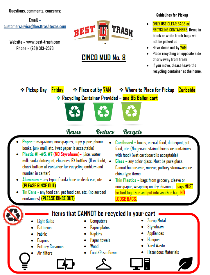 Trash collection days are TUESDAY and FRIDAY, recycle collection is FRIDAY. Please have trash out to the curb by 7:00 a.m. each collection day. Trash may be placed in containers (30-50 gallons) or bags (not exceeding 40 pounds). Best Trash will provide one 64 gallon recycle cart to each resident. On each regularly scheduled collection day, Best Trash will collect residential trash located at the curbside.